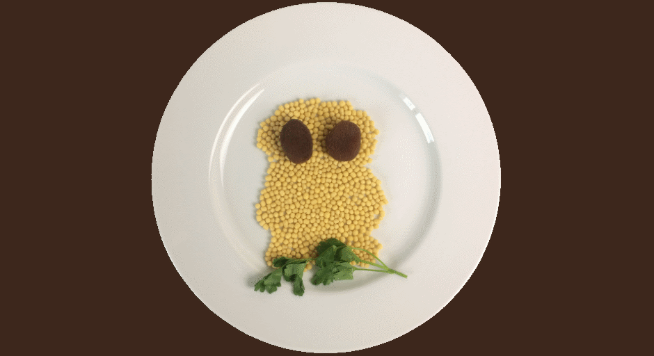 Erst einmal die Eule legen. Zum Beispiel aus Kous Kous und mit Softaprikosenaugen auf Petersilienzweig sitzend.