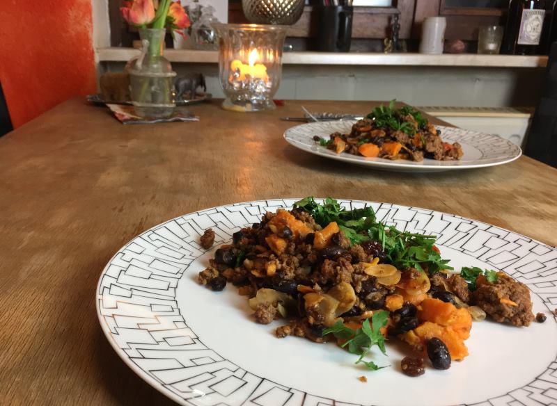 Orientalisches Hackfleisch mit Bataten & schwarzen Bohnen
