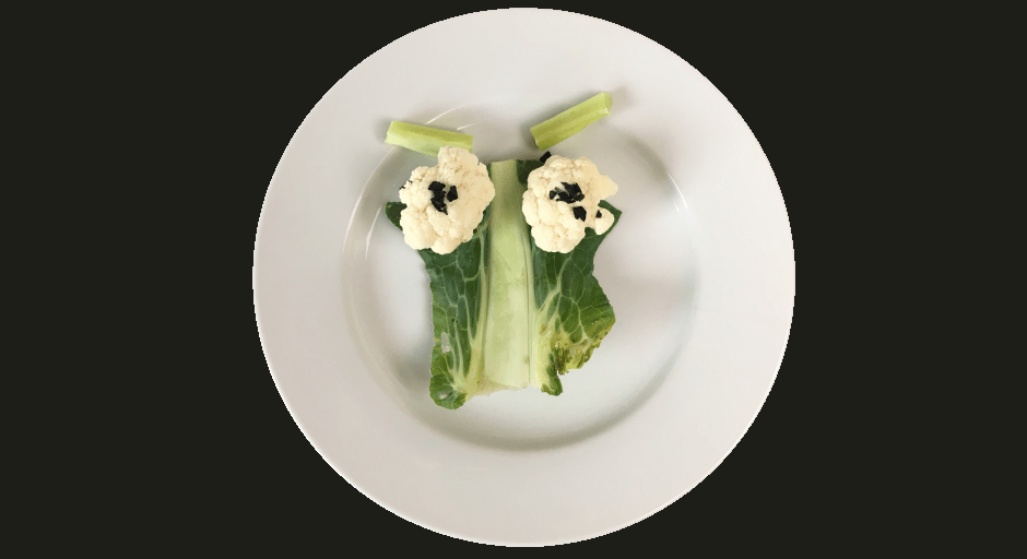Die Hauptherausforderung des Gerichts ist sicherlich die Eule! Bei so wenigen Zutaten hat man nicht viel Auswahl und Blumenkohl ist auch etwas sperrig. Aber wir haben es geschafft, indem wir die Blätter des Blumenkohls (die nicht zum Gericht gehören) mit einbezogen haben.
