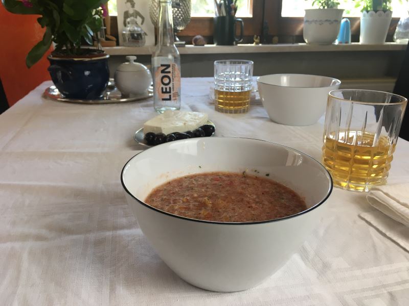 Wer will, kann sich nun noch etwas Schafskäse über das Gazpacho bröseln – oder ihn nebenbei mit den Oliven genießen.